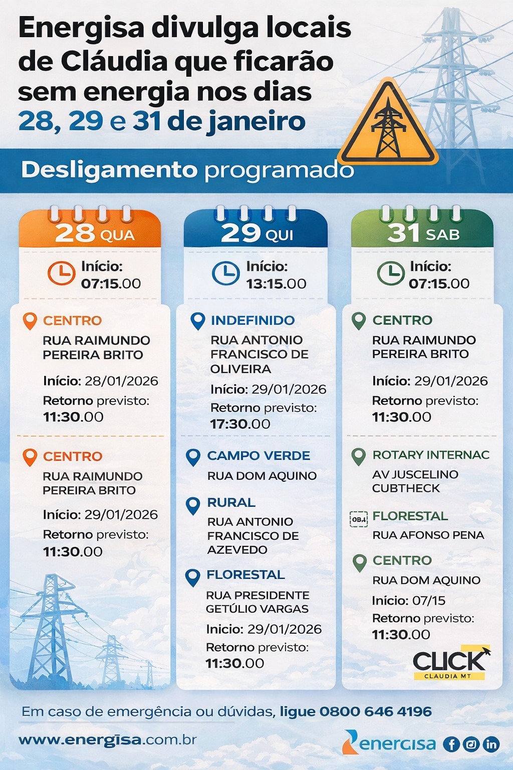 A Energisa informou que realizará desligamentos programados de energia elétrica no município de Cláudia, nos dias 28, 29 e 31 de janeiro, para serviços de manutenção e melhorias na rede.