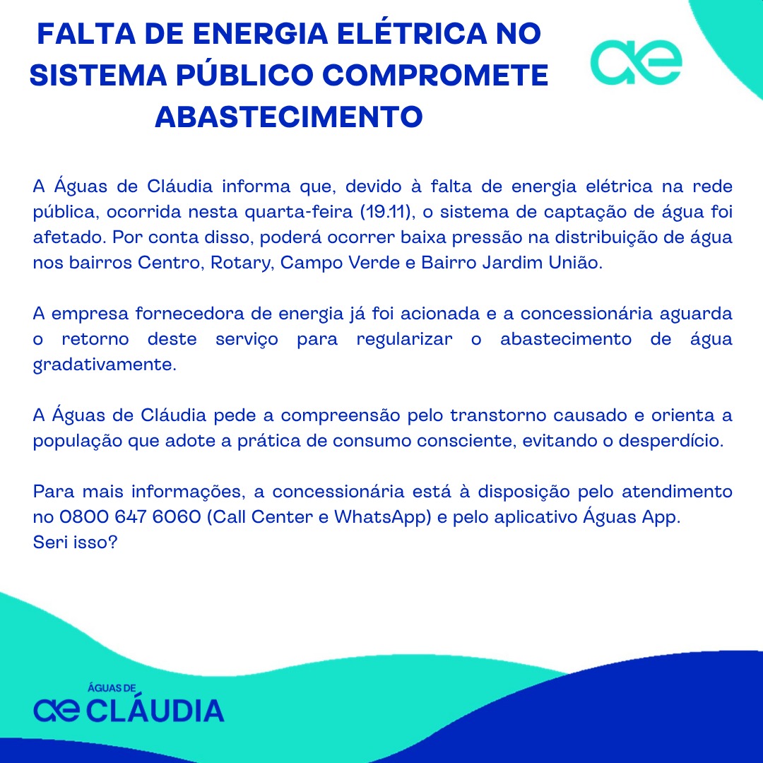 A Águas de Cláudia informa que, devido à falta de energia elétrica na rede pública, ocorrida nesta quarta-feira (19.11), o sistema de captação de água foi afetado. Por conta disso, poderá ocorrer baixa pressão na distribuição de água nos bairros Centro, Rotary, Campo Verde e Bairro Jardim União.
